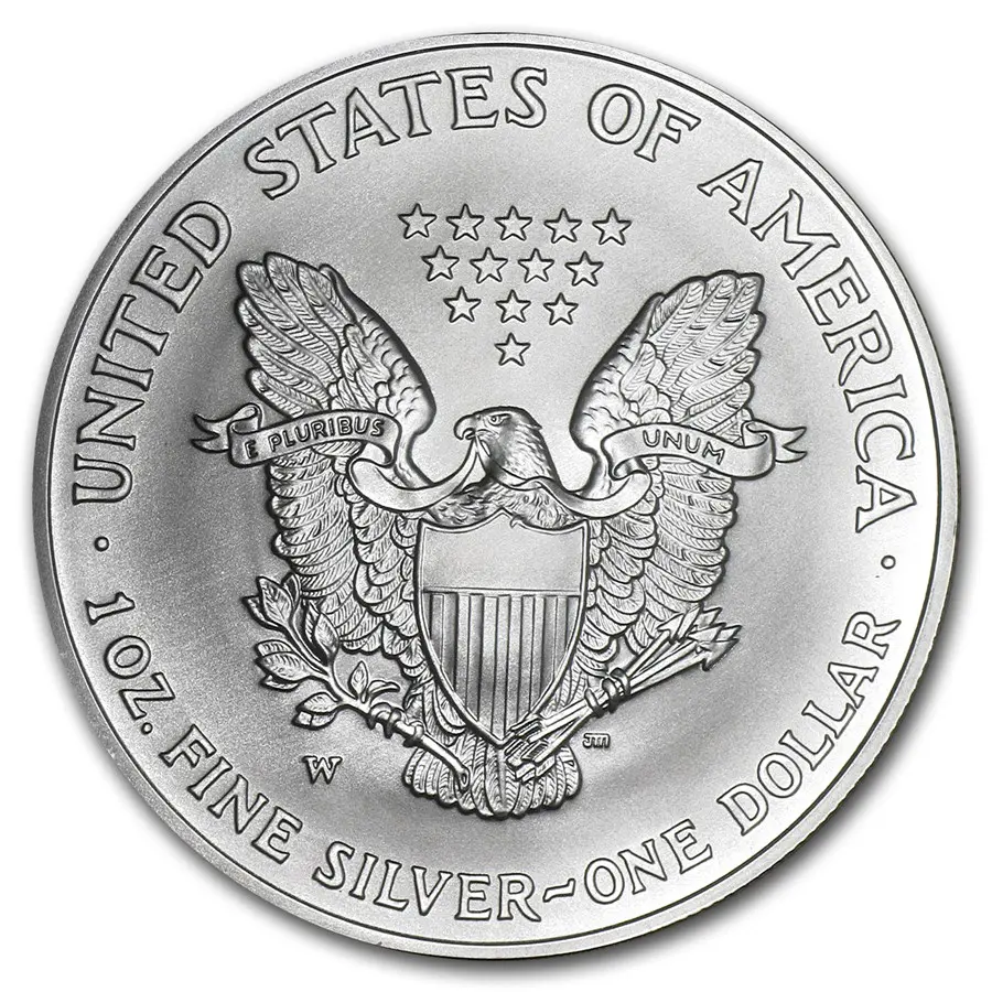 На реверсе монеты величественно возвышается белоголовый орлан — государственный символ США: с распростёртыми крыльями он оберегает щит с 13 полосами, символизирующими первые штаты. В лапах орлан держит оливковую ветвь (символ мира) и пучок стрел (готовность к защите), а в клюве — ленту с девизом «E PLURIBUS UNUM» («Из многих — единое»). Над птицей сияет созвездие из 13 звёзд, олицетворяющее единство колоний. По кругу выгравированы надписи: «UNITED STATES OF AMERICA», «1 OZ. FINE SILVER — ONE DOLLAR», а также знак монетного двора («W»). Композиция воплощает силу, единство и идеалы страны.
