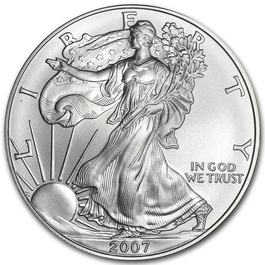 Вдоль верхнего края монеты выгравировано слово «LIBERTY» (Свобода), а справа красуется надпись «IN GOD WE TRUST» («На Бога уповаем») — национальный девиз США. В нижней части указан год выпуска — 2007. Этот аверс — не просто изображение, а целая история о ценностях, которые бережёт Америка: свободе, мире, силе и вере.