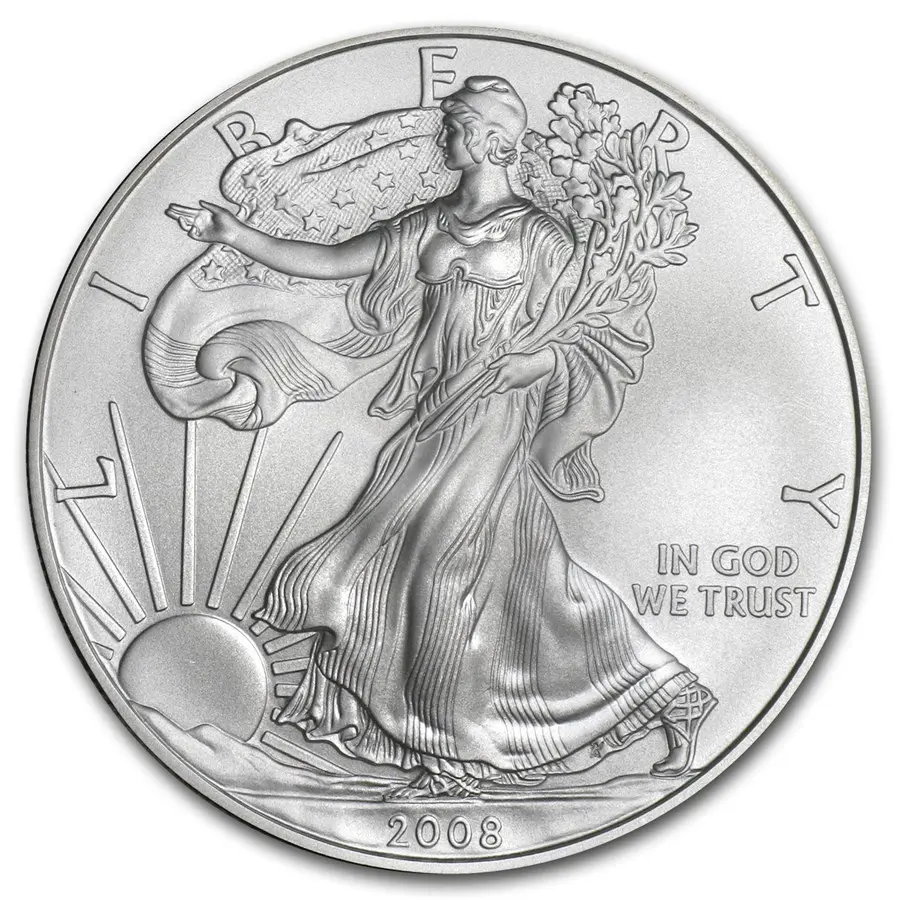 Вдоль верхнего края монеты выгравировано слово «LIBERTY» (Свобода), а справа красуется надпись «IN GOD WE TRUST» («На Бога уповаем») — национальный девиз США. В нижней части указан год выпуска — 2008. Этот аверс — не просто изображение, а целая история о ценностях, которые бережёт Америка: свободе, мире, силе и вере.
