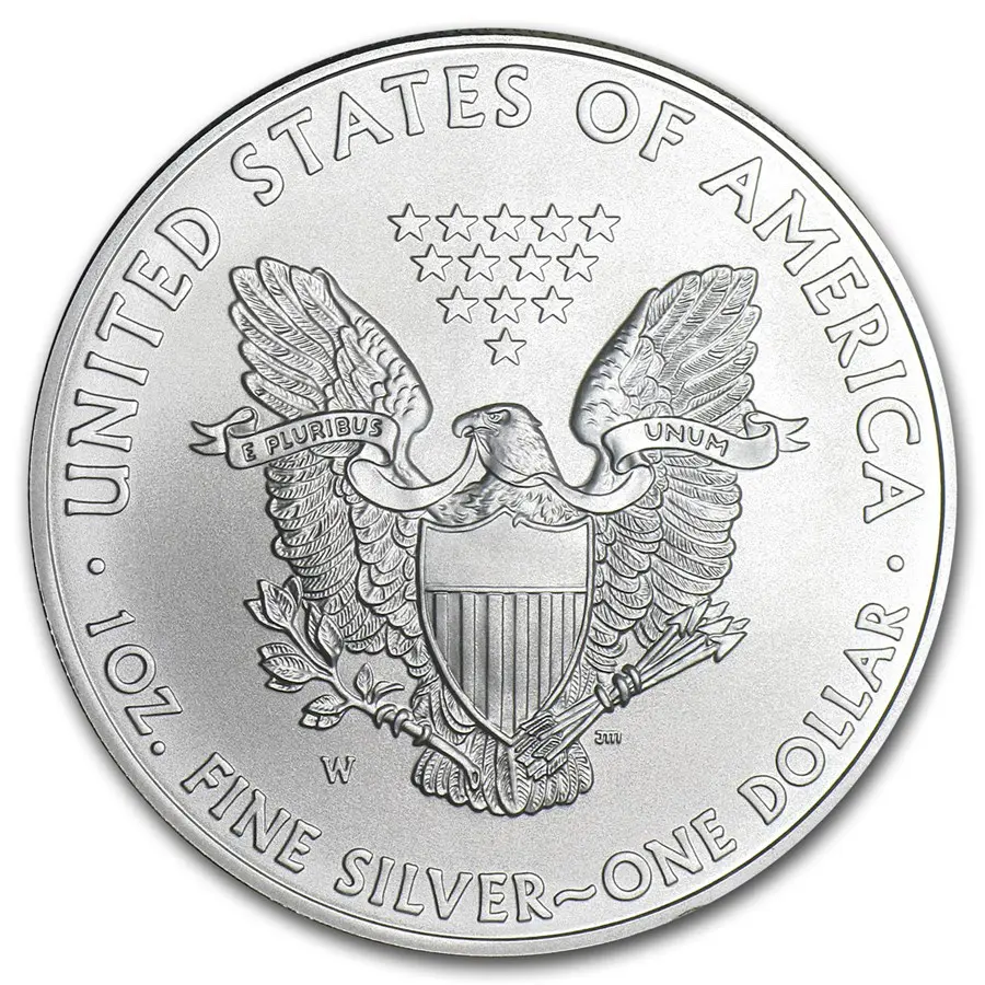 На реверсе монеты величественно возвышается белоголовый орлан — государственный символ США: с распростёртыми крыльями он оберегает щит с 13 полосами, символизирующими первые штаты. В лапах орлан держит оливковую ветвь (символ мира) и пучок стрел (готовность к защите), а в клюве — ленту с девизом «E PLURIBUS UNUM» («Из многих — единое»). Над птицей сияет созвездие из 13 звёзд, олицетворяющее единство колоний. По кругу выгравированы надписи: «UNITED STATES OF AMERICA», «1 OZ. FINE SILVER — ONE DOLLAR», а также знак монетного двора («W»). Композиция воплощает силу, единство и идеалы страны.