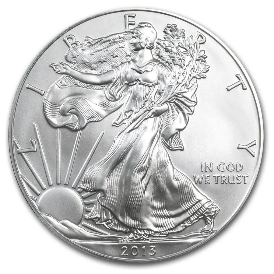Вдоль верхнего края монеты выгравировано слово «LIBERTY» (Свобода), а справа красуется надпись «IN GOD WE TRUST» («На Бога уповаем») — национальный девиз США. В нижней части указан год выпуска — 2013. Этот аверс — не просто изображение, а целая история о ценностях, которые бережёт Америка: свободе, мире, силе и вере.