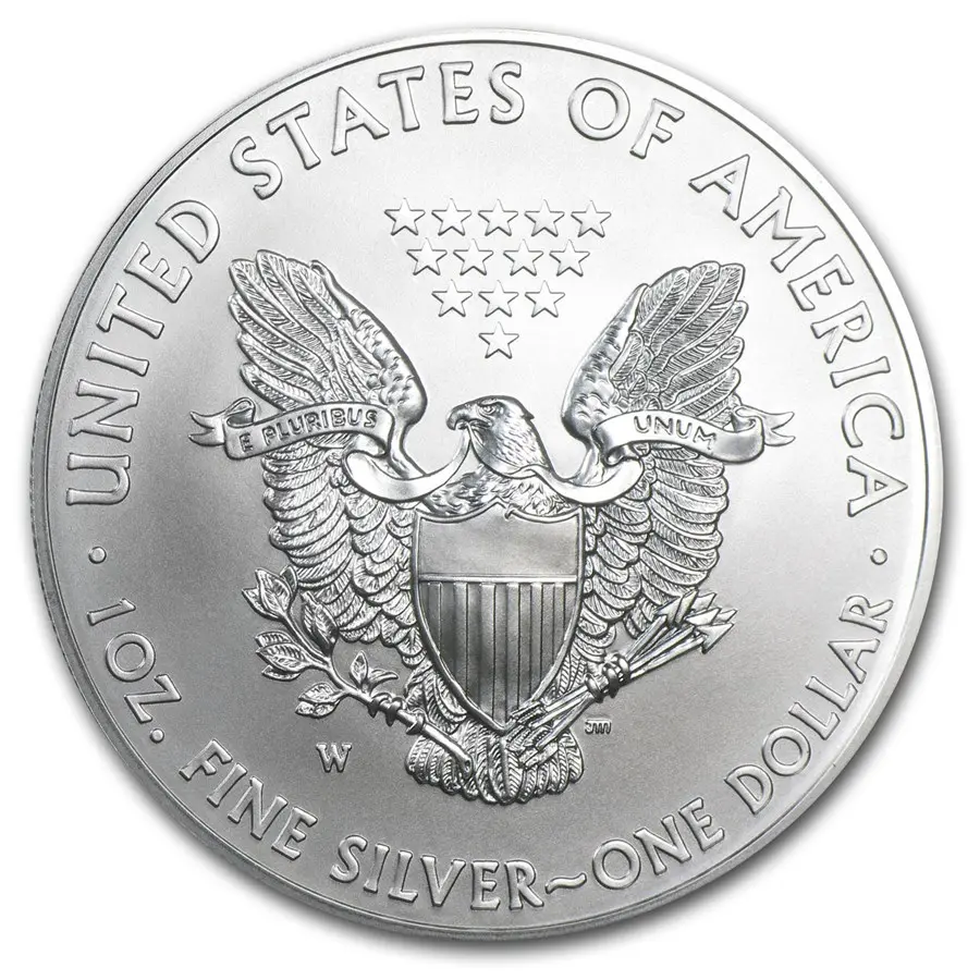 На реверсе монеты величественно возвышается белоголовый орлан — государственный символ США: с распростёртыми крыльями он оберегает щит с 13 полосами, символизирующими первые штаты. В лапах орлан держит оливковую ветвь (символ мира) и пучок стрел (готовность к защите), а в клюве — ленту с девизом «E PLURIBUS UNUM» («Из многих — единое»). Над птицей сияет созвездие из 13 звёзд, олицетворяющее единство колоний. По кругу выгравированы надписи: «UNITED STATES OF AMERICA», «1 OZ. FINE SILVER — ONE DOLLAR», а также знак монетного двора («W»). Композиция воплощает силу, единство и идеалы страны.