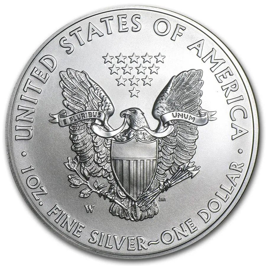 На реверсе монеты величественно возвышается белоголовый орлан — государственный символ США: с распростёртыми крыльями он оберегает щит с 13 полосами, символизирующими первые штаты. В лапах орлан держит оливковую ветвь (символ мира) и пучок стрел (готовность к защите), а в клюве — ленту с девизом «E PLURIBUS UNUM» («Из многих — единое»). Над птицей сияет созвездие из 13 звёзд, олицетворяющее единство колоний. По кругу выгравированы надписи: «UNITED STATES OF AMERICA», «1 OZ. FINE SILVER — ONE DOLLAR», а также знак монетного двора («W»). Композиция воплощает силу, единство и идеалы страны.