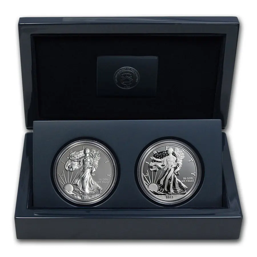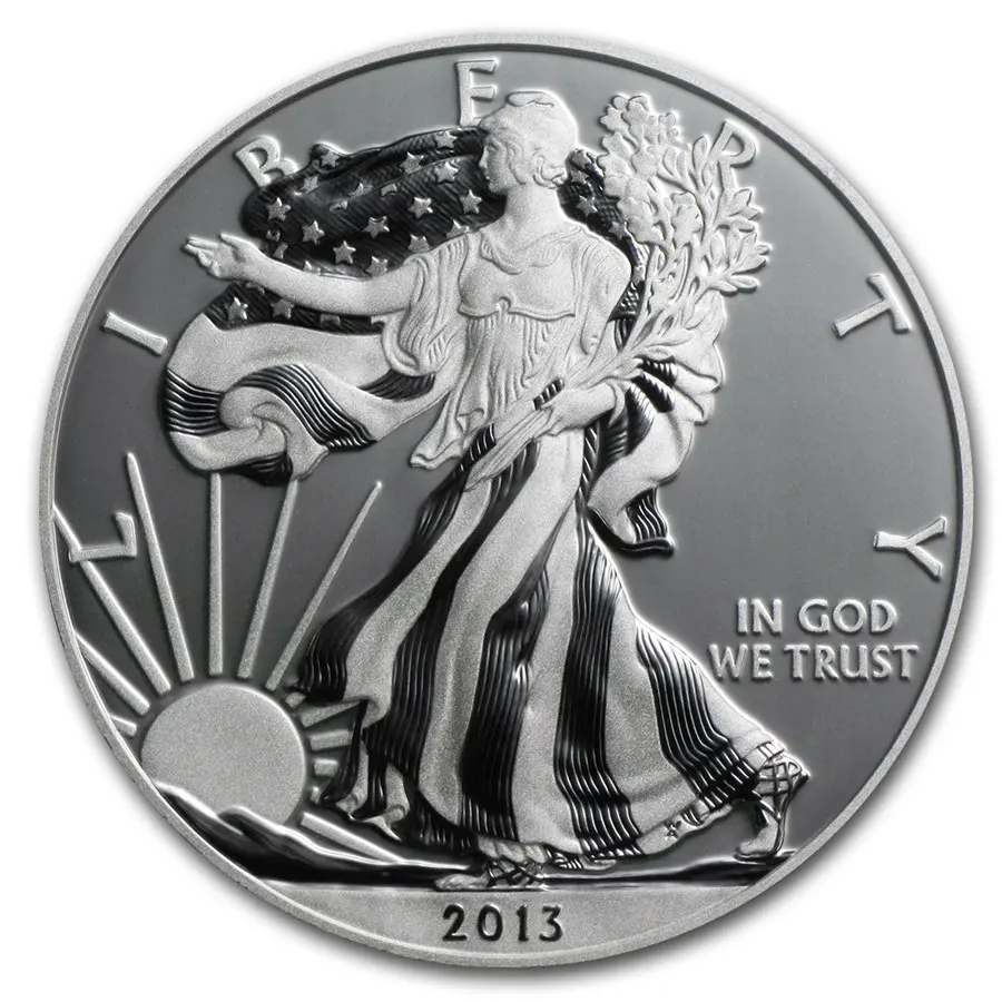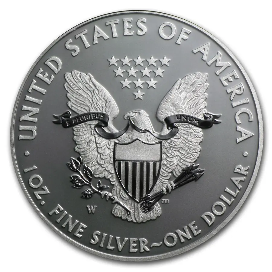 На аверсе монеты изображён величественный белоголовый орлан — национальный символ США: с распростёртыми крыльями он держит в лапах оливковую ветвь (символ мира) и пучок стрел (символ готовности к защите). На груди орлана — щит с 13 полосами, олицетворяющими первые штаты; над ним — созвездие из 13 звёзд. В клюве птица сжимает ленту с девизом «E PLURIBUS UNUM» («Из многих — единое»). По кругу выгравированы надписи: «UNITED STATES OF AMERICA», «1 OZ. FINE SILVER — ONE DOLLAR», а также знак монетного двора («W»).