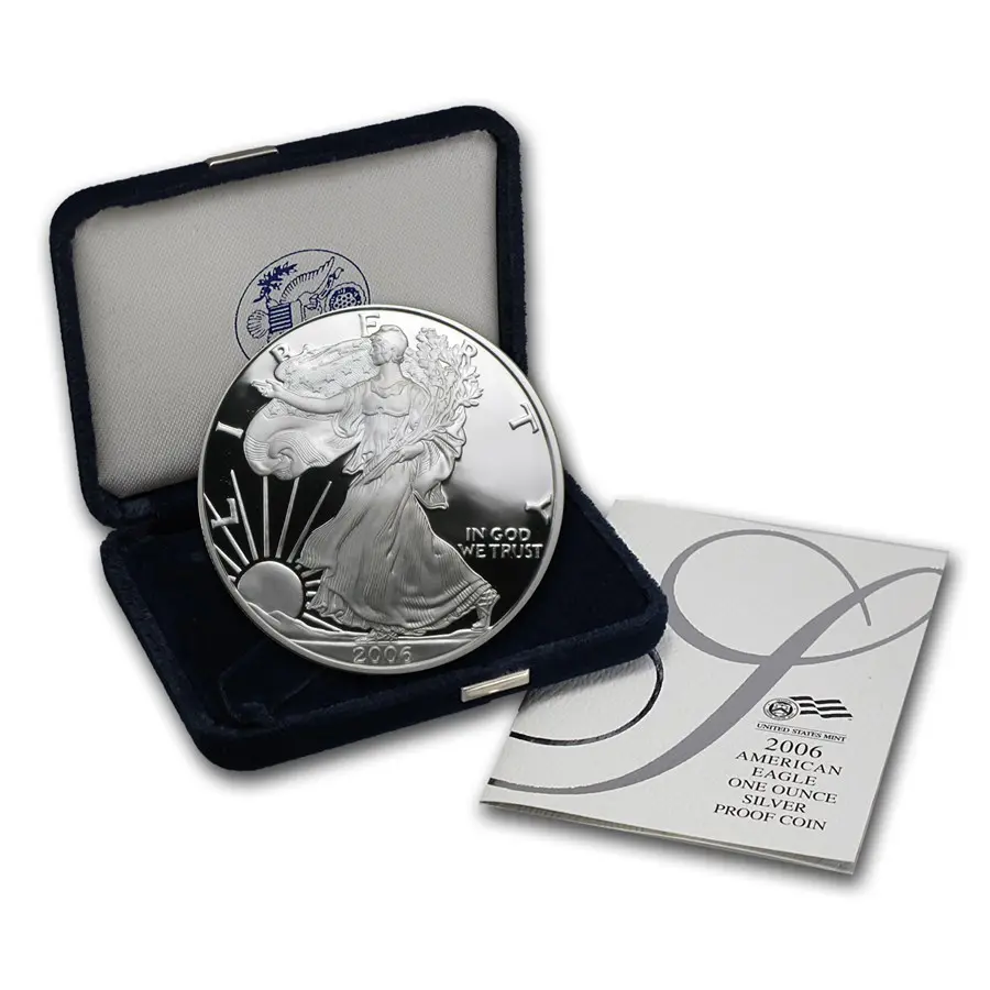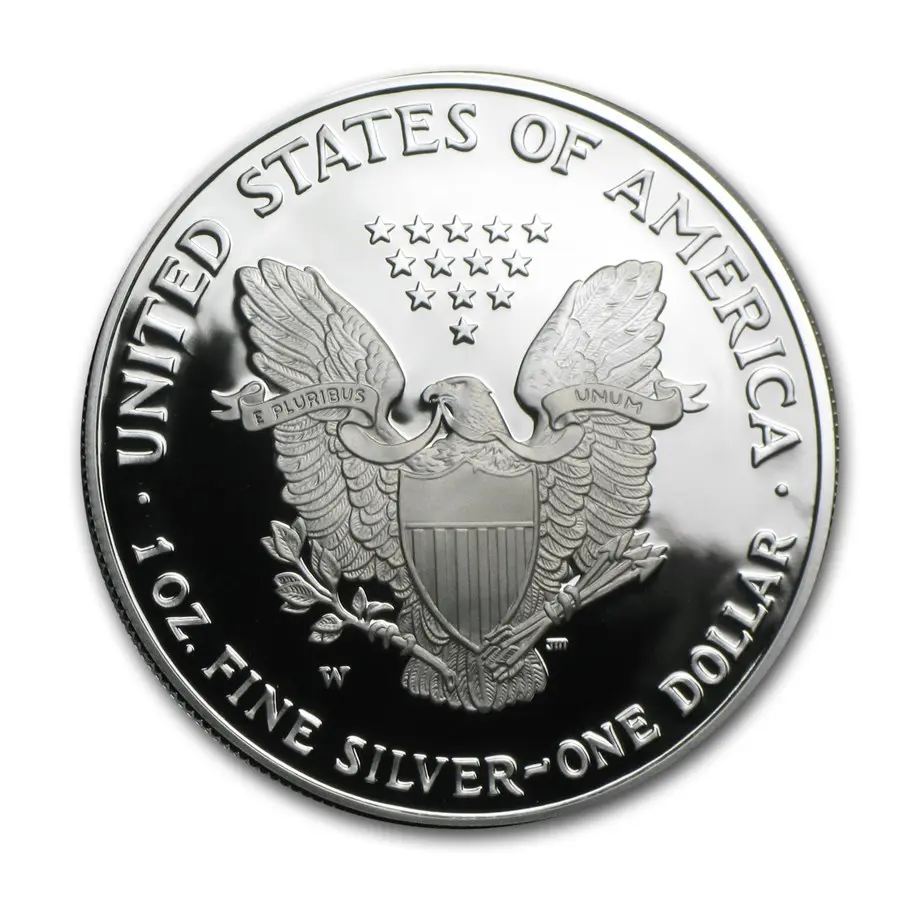 На реверсе монеты величественно возвышается белоголовый орлан — государственный символ США: с распростёртыми крыльями он оберегает щит с 13 полосами, символизирующими первые штаты. В лапах орлан держит оливковую ветвь (символ мира) и пучок стрел (готовность к защите), а в клюве — ленту с девизом «E PLURIBUS UNUM» («Из многих — единое»). Над птицей сияет созвездие из 13 звёзд, олицетворяющее единство колоний. По кругу выгравированы надписи: «UNITED STATES OF AMERICA», «1 OZ. FINE SILVER — ONE DOLLAR», а также знак монетного двора («W»). Композиция воплощает силу, единство и идеалы страны.