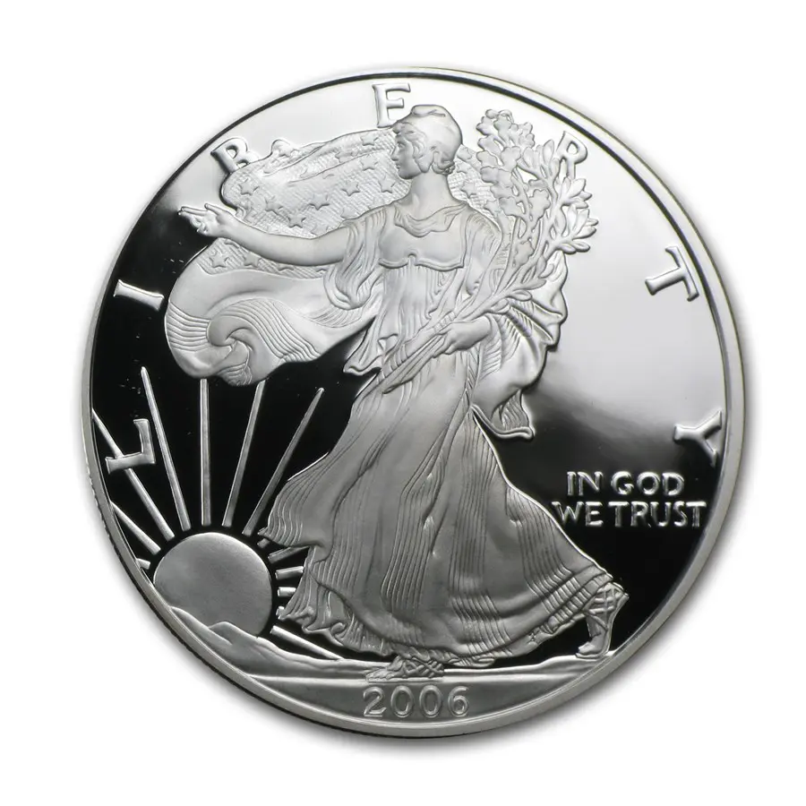 На аверсе монеты изображена аллегорическая фигура Свободы (Liberty) в развевающихся одеждах, шагающая вперёд с распростёртой рукой. В левой руке она держит пучок стрел и оливковую ветвь — символы готовности к защите и стремления к миру. За спиной Свободы — развевающийся плащ с изображением звёзд, а слева восходит солнце, символизирующее надежду и новое начало. В верхней части монеты выгравировано слово «LIBERTY», справа — девиз «IN GOD WE TRUST», а в нижней части указан год выпуска — 2006. Композиция воплощает идеалы свободы, силы и веры.