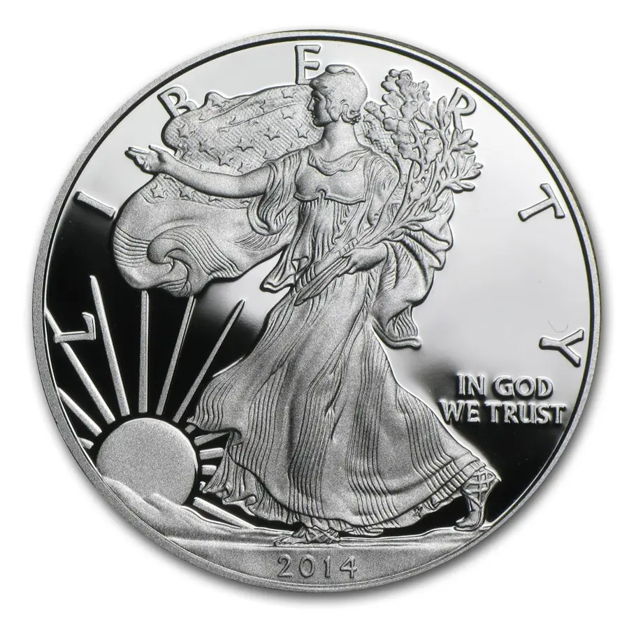 На аверсе монеты изображена аллегорическая фигура Свободы (Liberty) в развевающихся одеждах, шагающая вперёд с распростёртой рукой. В левой руке она держит пучок стрел и оливковую ветвь — символы готовности к защите и стремления к миру. За спиной Свободы — развевающийся плащ с изображением звёзд, а слева восходит солнце, символизирующее надежду и новое начало. В верхней части монеты выгравировано слово «LIBERTY», справа — девиз «IN GOD WE TRUST», а в нижней части указан год выпуска — 2014. Композиция воплощает идеалы свободы, силы и веры.