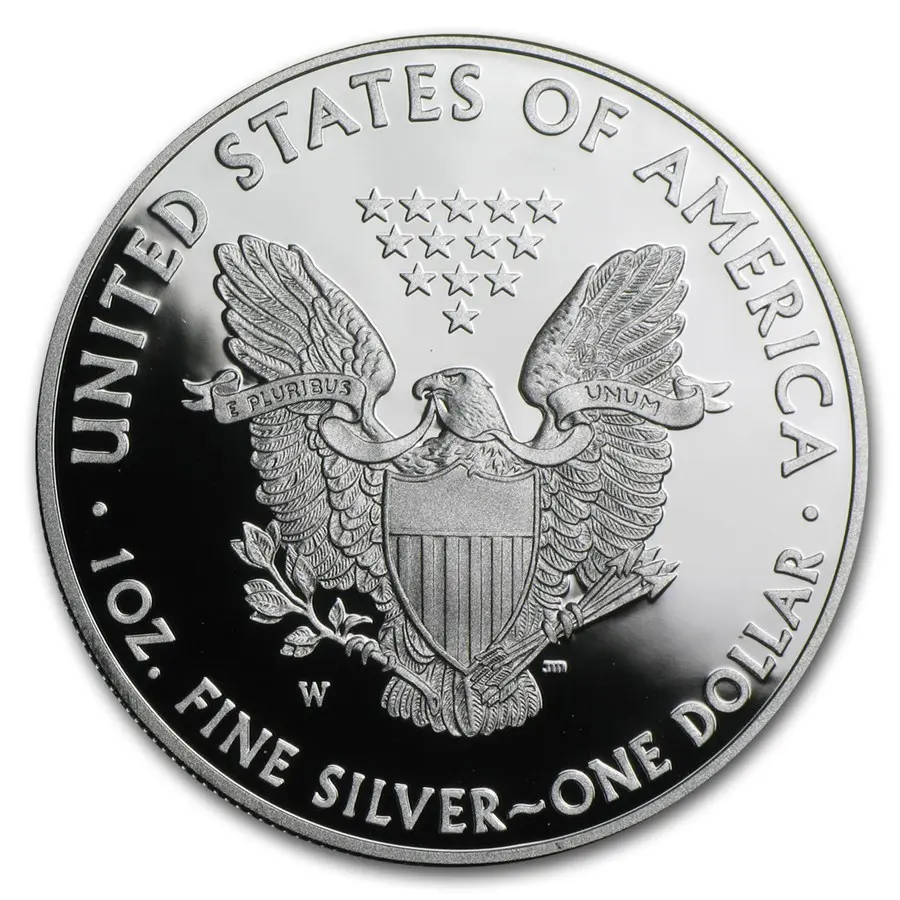 На реверсе монеты величественно возвышается белоголовый орлан — государственный символ США: с распростёртыми крыльями он оберегает щит с 13 полосами, символизирующими первые штаты. В лапах орлан держит оливковую ветвь (символ мира) и пучок стрел (готовность к защите), а в клюве — ленту с девизом «E PLURIBUS UNUM» («Из многих — единое»). Над птицей сияет созвездие из 13 звёзд, олицетворяющее единство колоний. По кругу выгравированы надписи: «UNITED STATES OF AMERICA», «1 OZ. FINE SILVER — ONE DOLLAR», а также знак монетного двора («W»). Композиция воплощает силу, единство и идеалы страны.