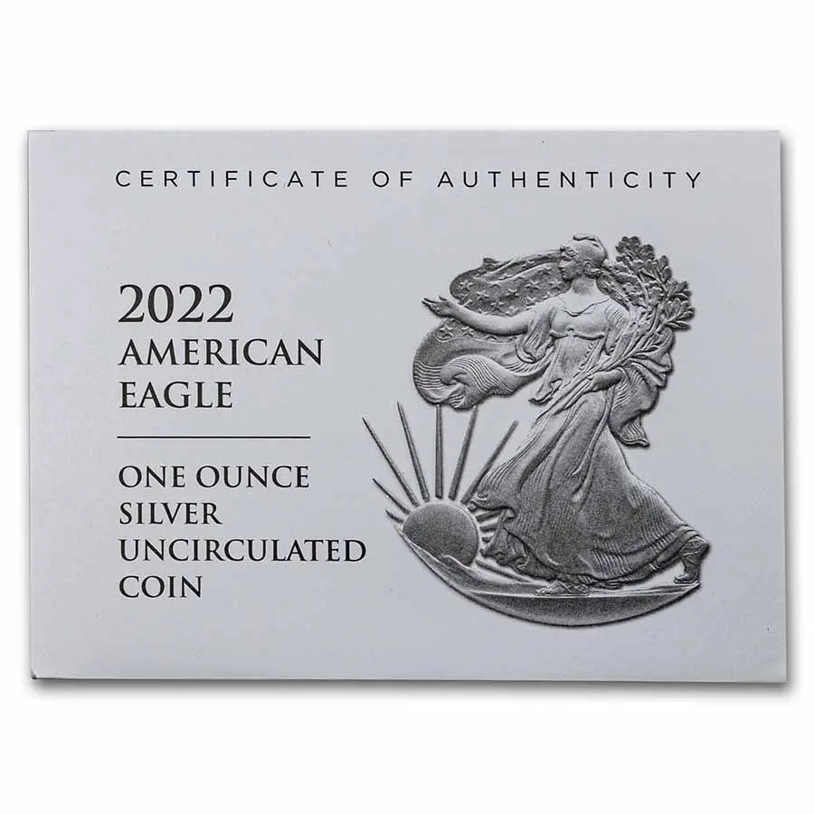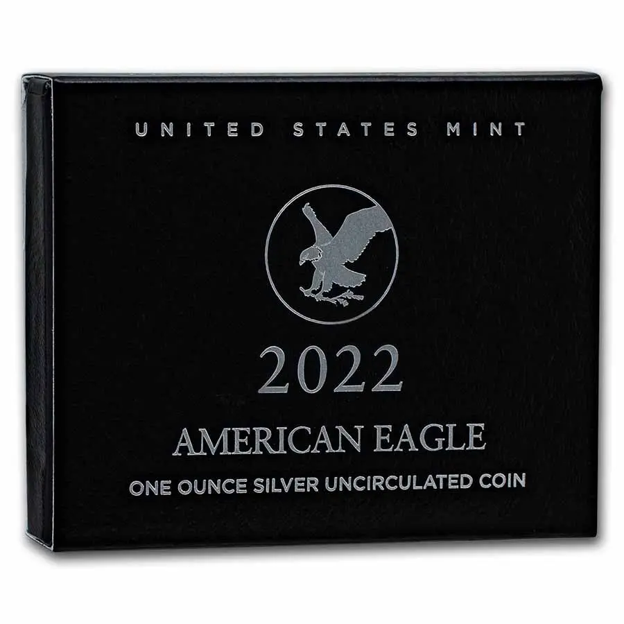 На реверсе серебряной монеты «Американский Орёл» (Type 2, с 2021 года) изображён величественный белоголовый орлан в полёте, плавно опускающийся на ветку с дубовыми листьями — символ силы, стойкости и роста нации. Его мощные крылья широко раскинуты, перья прорисованы с поразительной детализацией, подчёркивая реалистичность исполнения. Вдоль верхнего края монеты выгравирована надпись «UNITED STATES OF AMERICA», внизу — «ONE DOLLAR • 1 OZ. FINE SILVER», а справа вертикально размещён национальный девиз «E PLURIBUS UNUM». Дизайн, созданный художницей Эмили Дамстра, напоминает реверс долларовой монеты Эйзенхауэра 1971 года и олицетворяет современность, органично вписанную в традиции американского монетного дела.