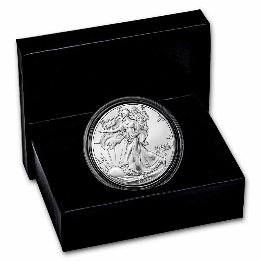 На аверсе монеты изображена аллегорическая фигура Свободы (Liberty) в развевающихся одеждах, шагающая вперёд с распростёртой рукой. В левой руке она держит пучок стрел и оливковую ветвь — символы готовности к защите и стремления к миру. За спиной Свободы — развевающийся плащ с изображением звёзд, а слева восходит солнце, символизирующее надежду и новое начало. В верхней части монеты выгравировано слово «LIBERTY», справа — девиз «IN GOD WE TRUST», а в нижней части указан год выпуска — 2022. Композиция воплощает идеалы свободы, силы и веры.