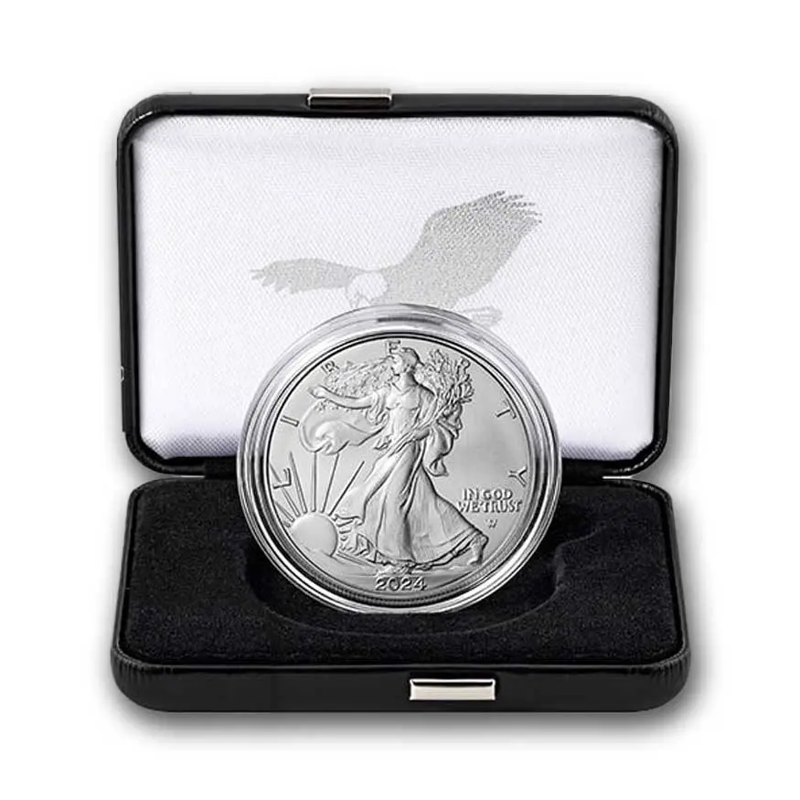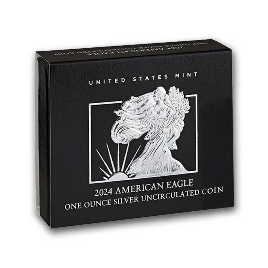 На реверсе серебряной монеты «Американский Орёл» (Type 2, с 2021 года) изображён величественный белоголовый орлан в полёте, плавно опускающийся на ветку с дубовыми листьями — символ силы, стойкости и роста нации. Его мощные крылья широко раскинуты, перья прорисованы с поразительной детализацией, подчёркивая реалистичность исполнения. Вдоль верхнего края монеты выгравирована надпись «UNITED STATES OF AMERICA», внизу — «ONE DOLLAR • 1 OZ. FINE SILVER», а справа вертикально размещён национальный девиз «E PLURIBUS UNUM». Дизайн, созданный художницей Эмили Дамстра, напоминает реверс долларовой монеты Эйзенхауэра 1971 года и олицетворяет современность, органично вписанную в традиции американского монетного дела.