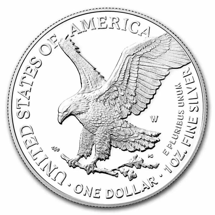 На реверсе серебряной монеты «Американский Орёл» (Type 2, с 2021 года) изображён величественный белоголовый орлан в полёте, плавно опускающийся на ветку с дубовыми листьями — символ силы, стойкости и роста нации. Его мощные крылья широко раскинуты, перья прорисованы с поразительной детализацией, подчёркивая реалистичность исполнения. Вдоль верхнего края монеты выгравирована надпись «UNITED STATES OF AMERICA», внизу — «ONE DOLLAR • 1 OZ. FINE SILVER», а справа вертикально размещён национальный девиз «E PLURIBUS UNUM». Дизайн, созданный художницей Эмили Дамстра, напоминает реверс долларовой монеты Эйзенхауэра 1971 года и олицетворяет современность, органично вписанную в традиции американского монетного дела.